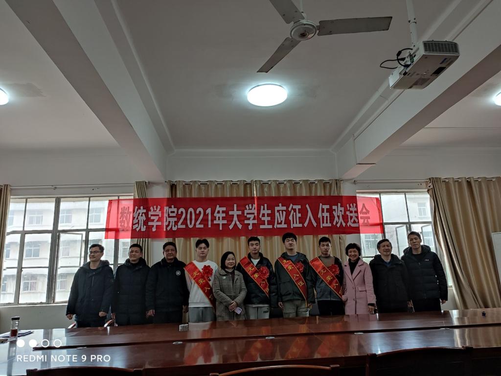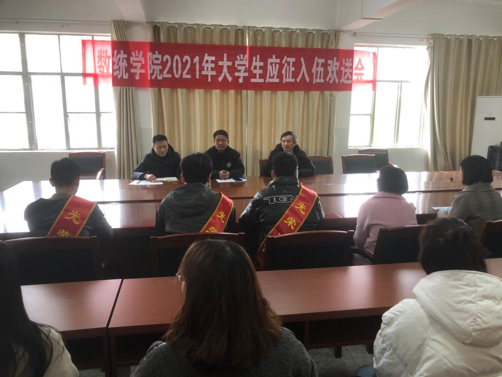 2021年3月11日下午,星空体育官网在三楼会议室隆重召开2021年大学生征兵入伍欢送会,院长胡付高、党总支书记林先安、党总支副书记艾明星、征兵辅导员吴舒展、班主任老师刘伟超、余胜平、吴庆华及全体入伍新兵参加欢送会。欢送会由艾明星主持。