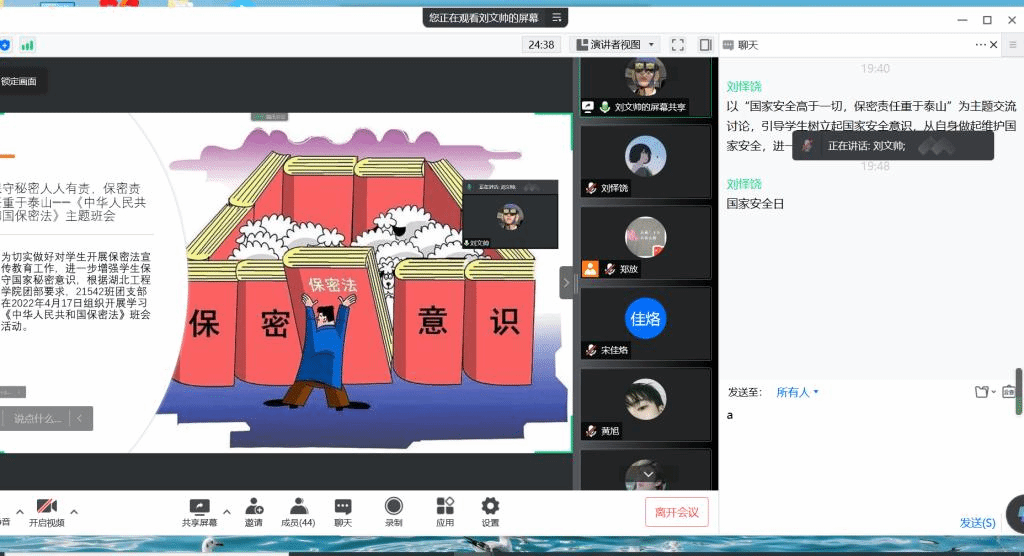 国家安全是头等大事!在“4·15国家安全教育日”来临之际,星空体育官方网站学子通过召开主题班会等形式,组织开展2022年国家安全教育日主题团日活动,切实增强同学们的国家安全意识。