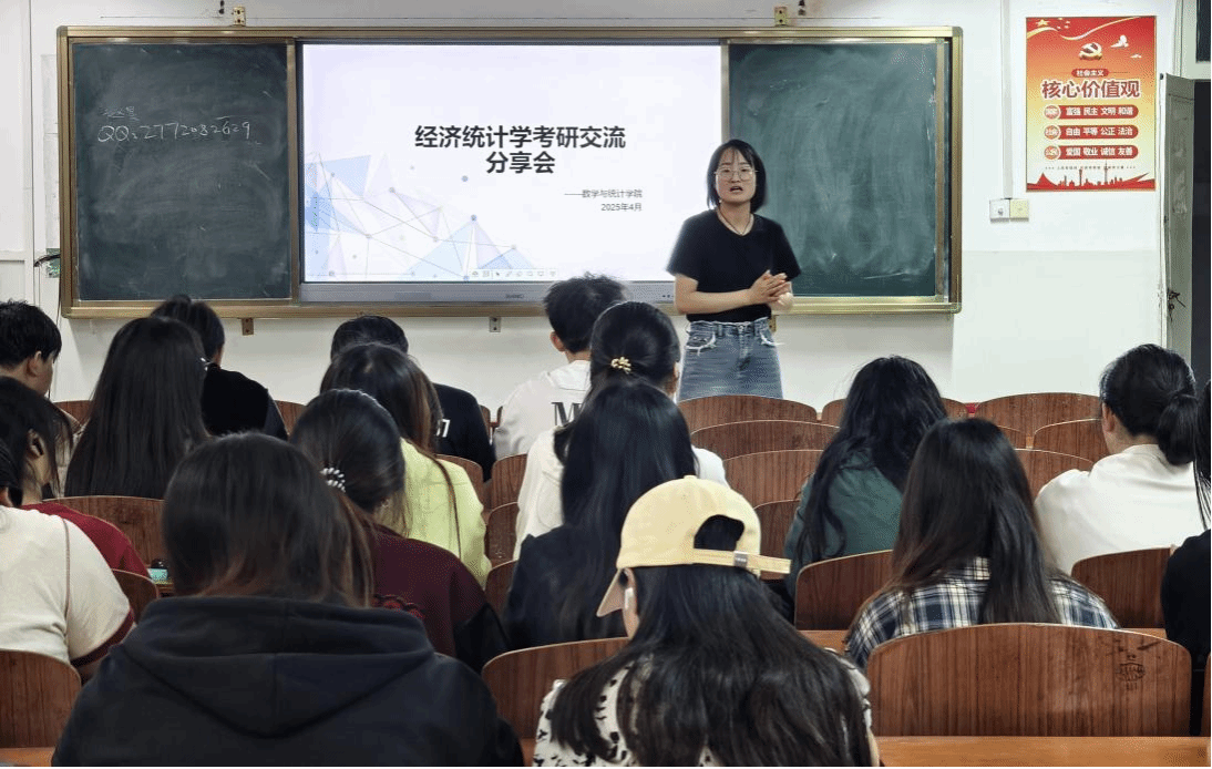 4月25日晚,星空体育官方网站于教6-211举办“经统研途,数说未来”考研经验交流会,特邀四位考研上岸学子返校分享备考经验。此次交流会由辅导员吴亚美主持,吸引百余名学生参与,聚焦跨考策略、学科方法论与心态管理等核心议题,搭建朋辈互助交流平台。
