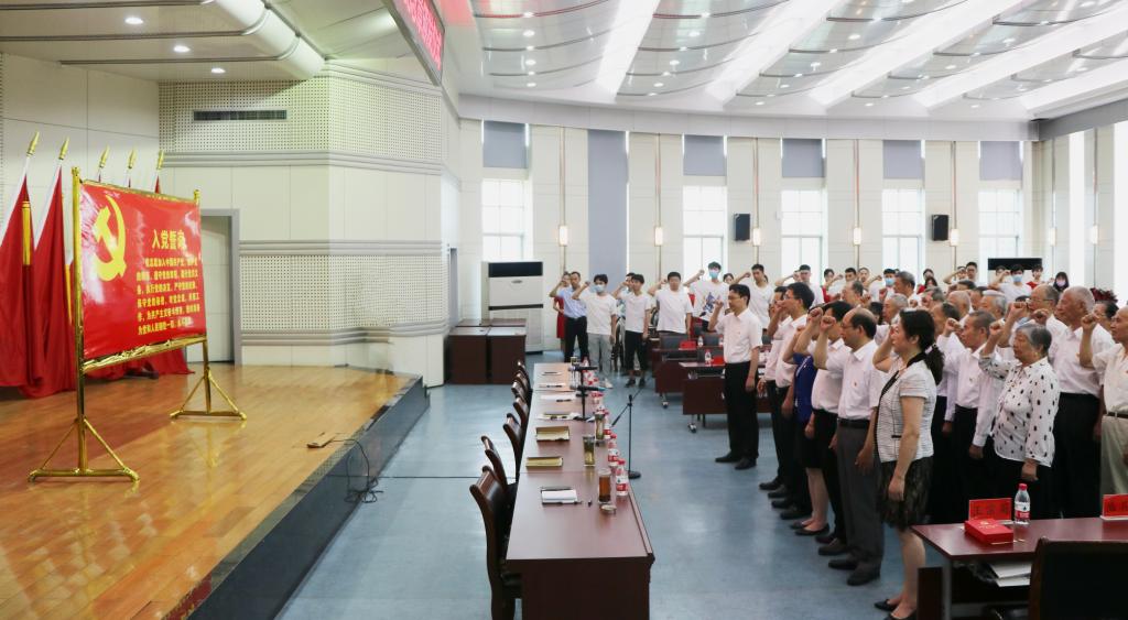 全体党员起立,奏唱中华人民共和国国歌。大家举起右手,在党委书记彭瑜的领誓下,重温入党誓词。