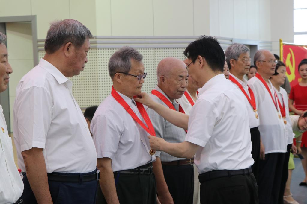 随后,彭瑜为老党员代表颁发“光荣在党50年”纪念章,青年学生代表向他们献花致敬。