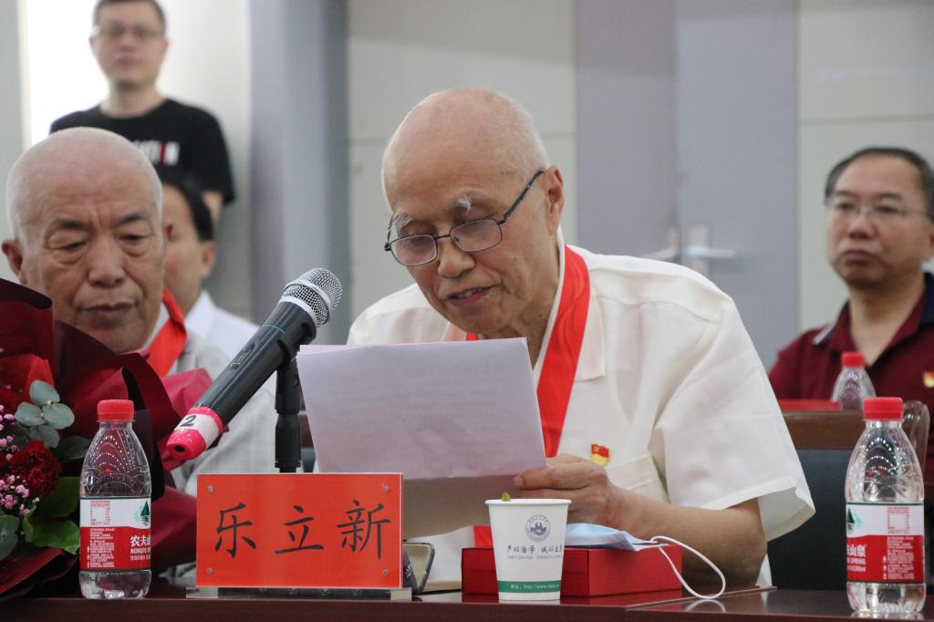 曾获“全国优秀教师”称号、化学与材料科学学院退休教师乐立新教授代表获颁纪念章的老党员作了情真意切的发言。