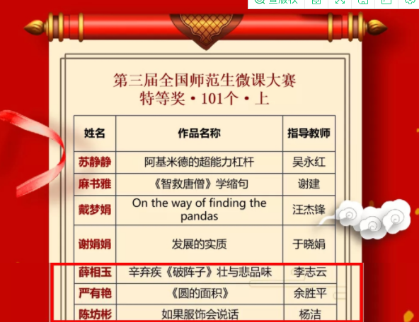 日前,从全国师范生微课大赛官方平台传来喜讯,星空体育官网选送的两件微课作品在第三届全国师范生微课大赛中全部获奖,其中0213011121班严有艳同学的作品《圆的面积》获特等奖(指导教师:余胜平)、0193011141班毛婉平同学作品《轴对称图形》获二等奖(指导教师:史杰),余胜平老师同时获评“优秀指导教师”。