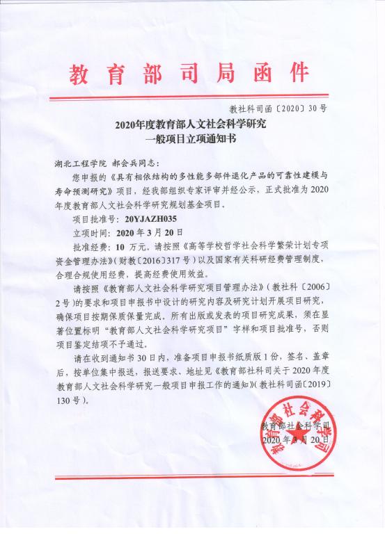 本网讯:近日,教育部发布2020年度人文社会科学研究项目立项通知,星空体育官网3个项目喜获立项。其中,星空体育官网郝会兵博士主持的《具有相依结构的多性能多部件退化产品的可靠性建模与寿命预测研究》获批规划基金项目,批准经费10万元,这也是郝会兵博士博士第二次获得教育部规划项目。据悉,星空体育官网教师近几年来共获得教育部自然科学重点项目、人文社科规划基金项目、青年项目8项。