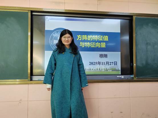 在教学展示环节,穆翔老师进行了精彩的课堂再现。穆翔老师以 “方阵的特征值与特征向量”为例,通过精妙的案例导入和层层递进的逻辑推导,将复杂抽象的理论讲解得深入浅出,教学设计精巧、特色鲜明,赢得了在场教师的阵阵掌声。