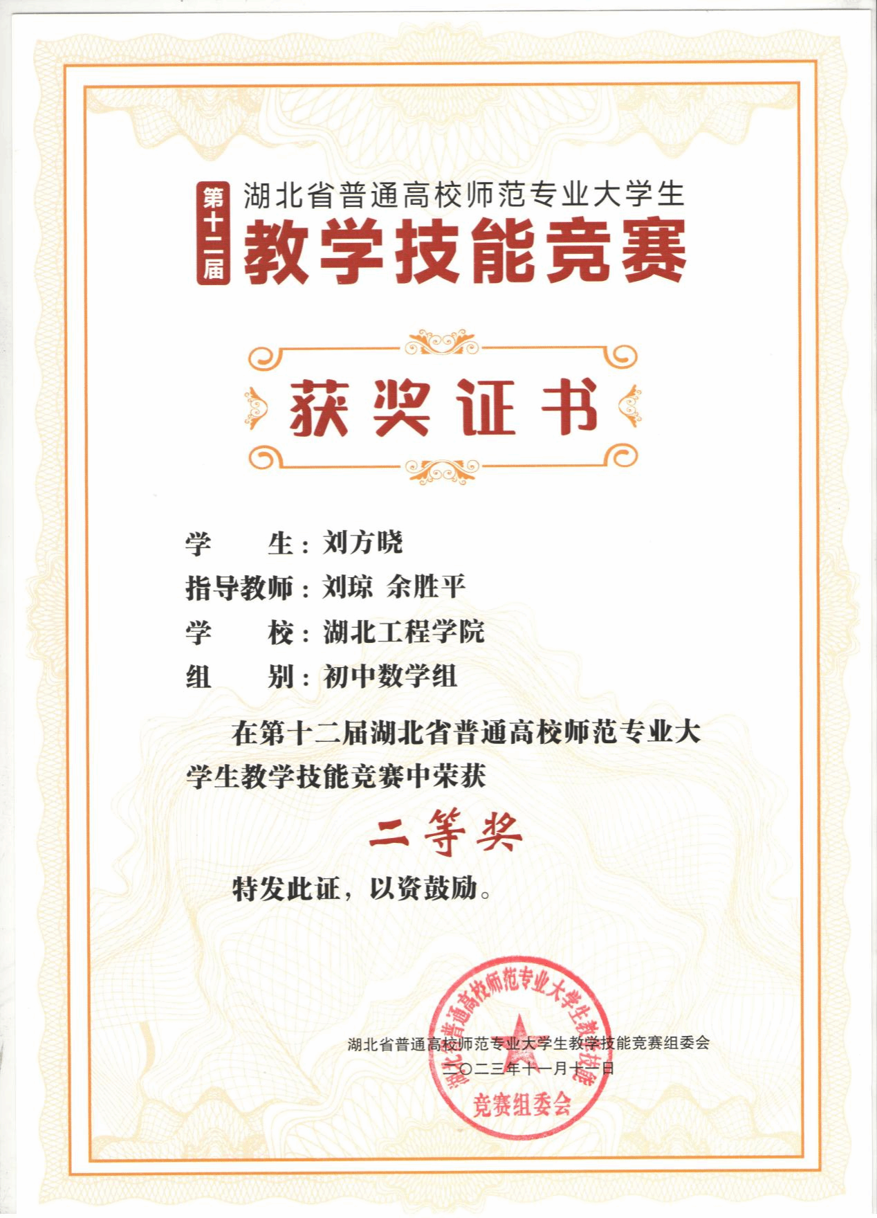 2023年11月11日,第十二届湖北省普通高校师范专业大学生教学技能竞赛决赛在华中师范大学圆满落幕,星空体育官网两名数学与应用数学专业学生在全省十几所参赛高校中脱颖而出,创星空体育官网参加此项赛事以来最好成绩,其中李丹获得高中数学组一等奖(指导老师:曾梅兰、周俊超),刘方晓获得初中数学组二等奖(指导老师:刘琼、余胜平),充分展现了星空体育官网数学与应用数学专业学生扎实的专业知识、教学技能和综合素养。